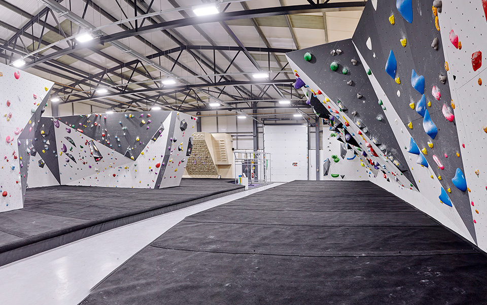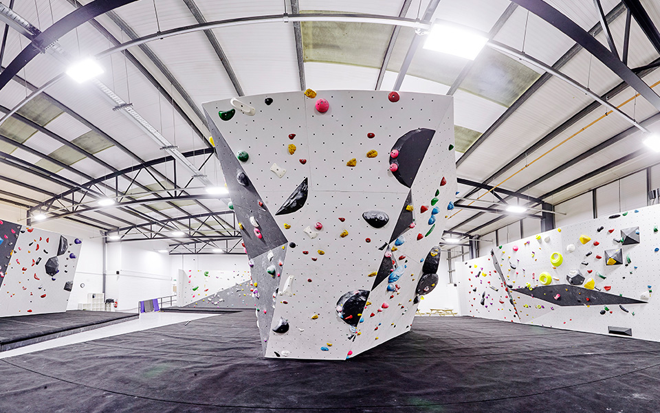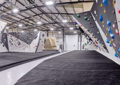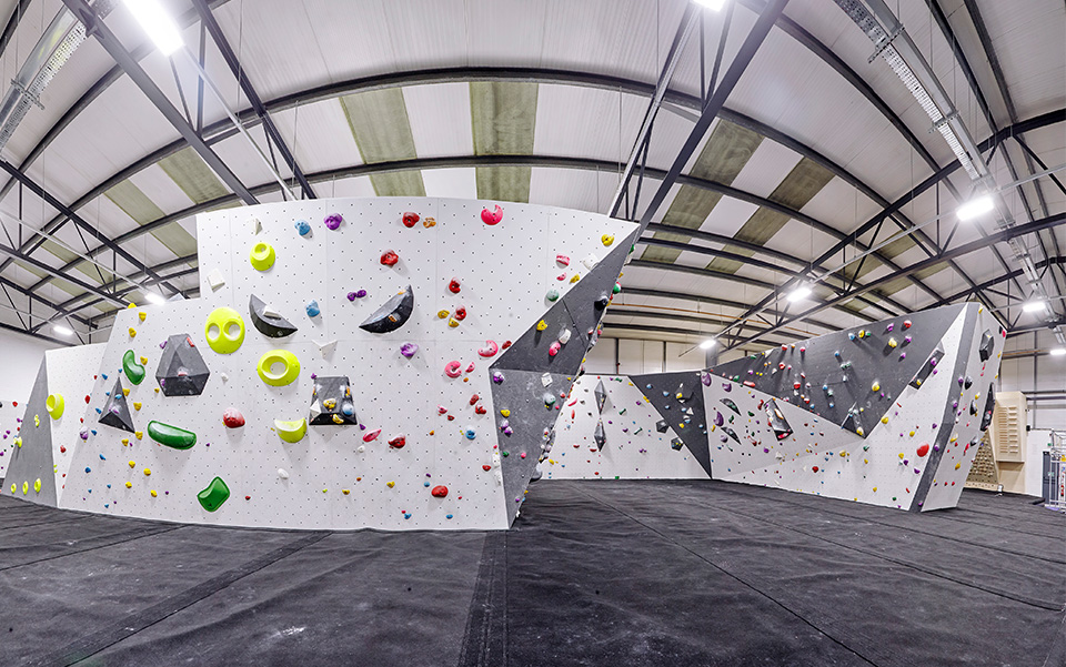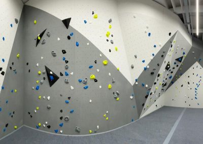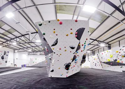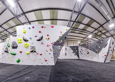 CAD drawings and CNC precision cutting tools are used to create complex and dynamically shaped climbing walls. Designed and constructed using a combination of geometric shapes and angles the climbing wall panels are fitted with a dense fixing grid for bolt on holds and maximum route setting potential.
